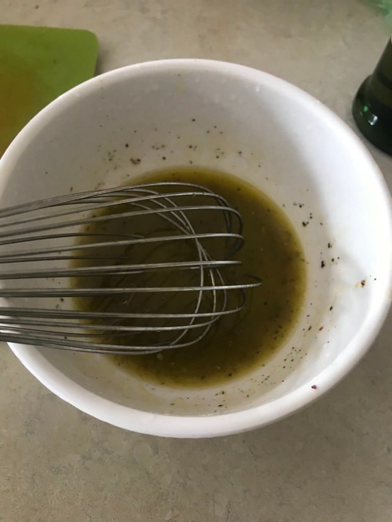 + Add lemon juice, salt, pepper, and olive oil to bowl and whisk
