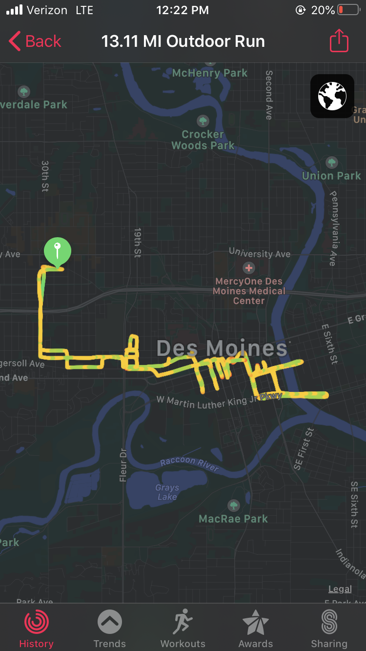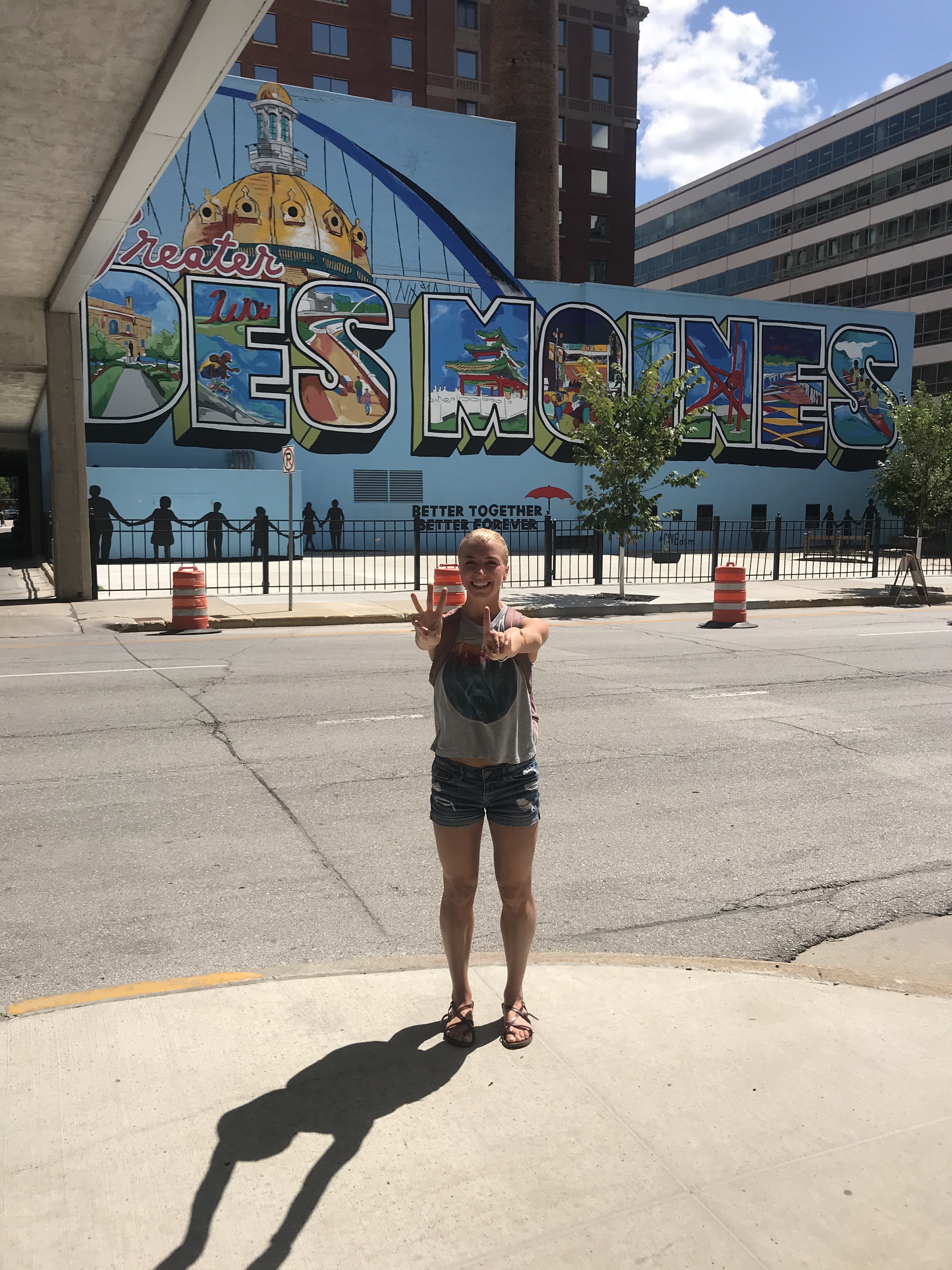 The run was GORGEOUS. Honestly. I had no idea what to expect in Des Moines, Iowa – but I can absolutely say that I would go back in a heart-beat. The downtown area was bustling, energized, and bright – especially for a Monday morning. The city was laced with building-art, a sculpture park, restaurants and bars, and several beautiful bridges over the river (which I totally crossed several times during my 13 miles). I ran up and down the city streets, trying to bookmark each of the places that I wanted to return to after check-out. The sun lit my face up as I finished up the last .1 miles down 31st street back to my place. 13.1 miles in Des Moines, Iowa – such a beautiful first stop on my summer-series.