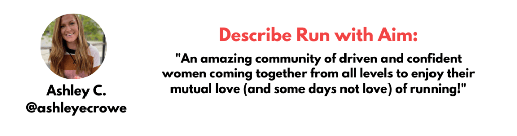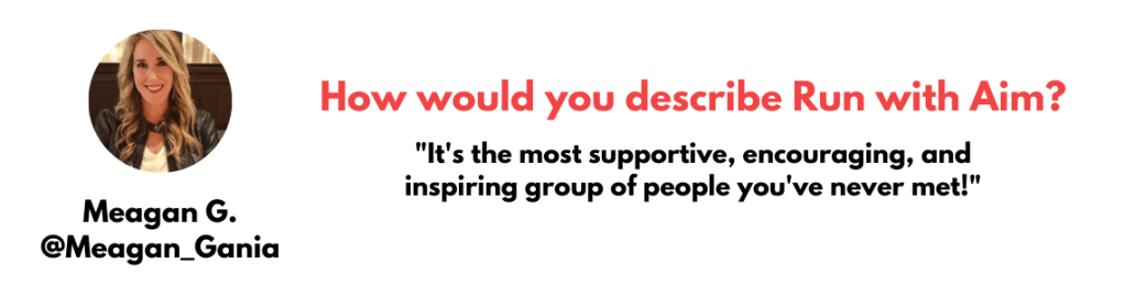 JOIN RUN WITH AIM: A supportive & encouraging community of female runners from around the world that come together to run, have fun, and get shit done – in running and life! Accomplish your goals, participate in fun challenges, win prizes, and meet other female runners who will cheer you on along the way!